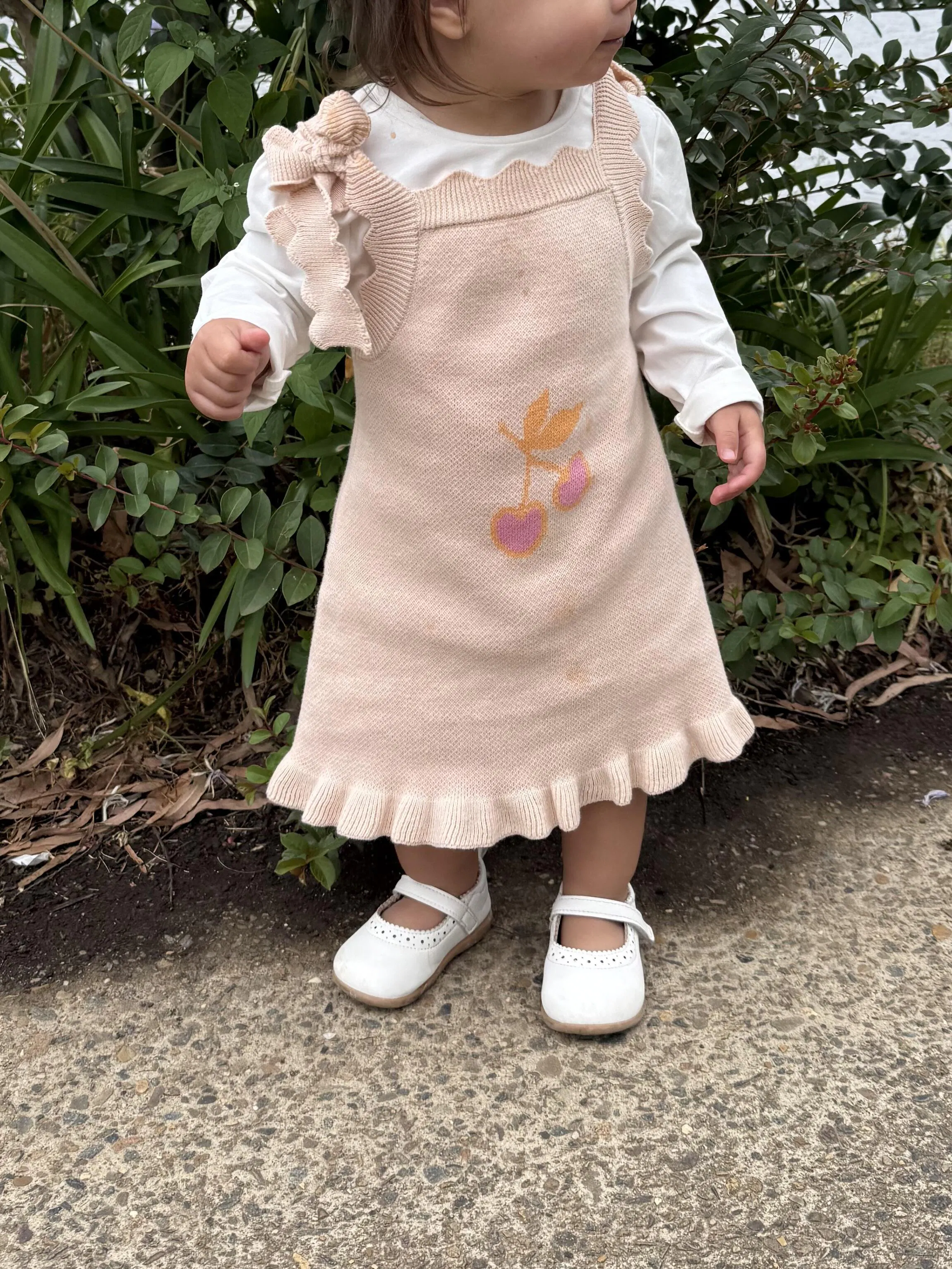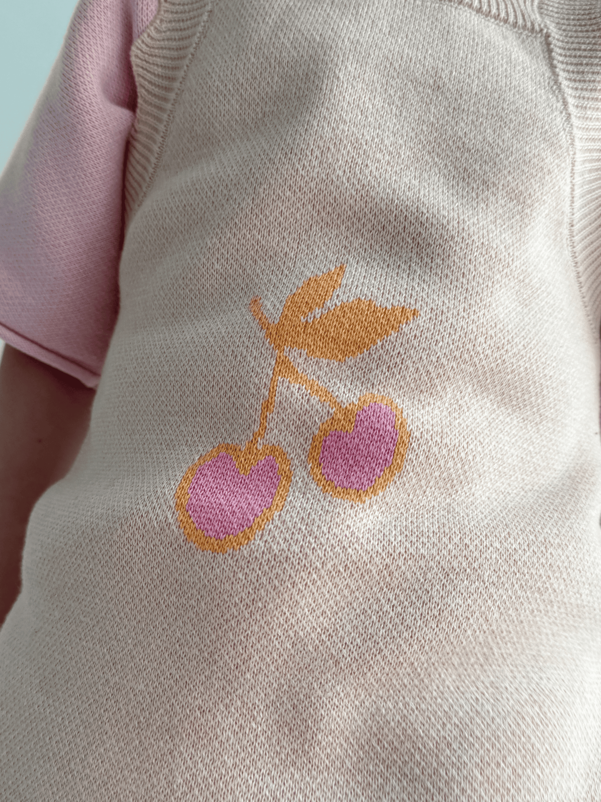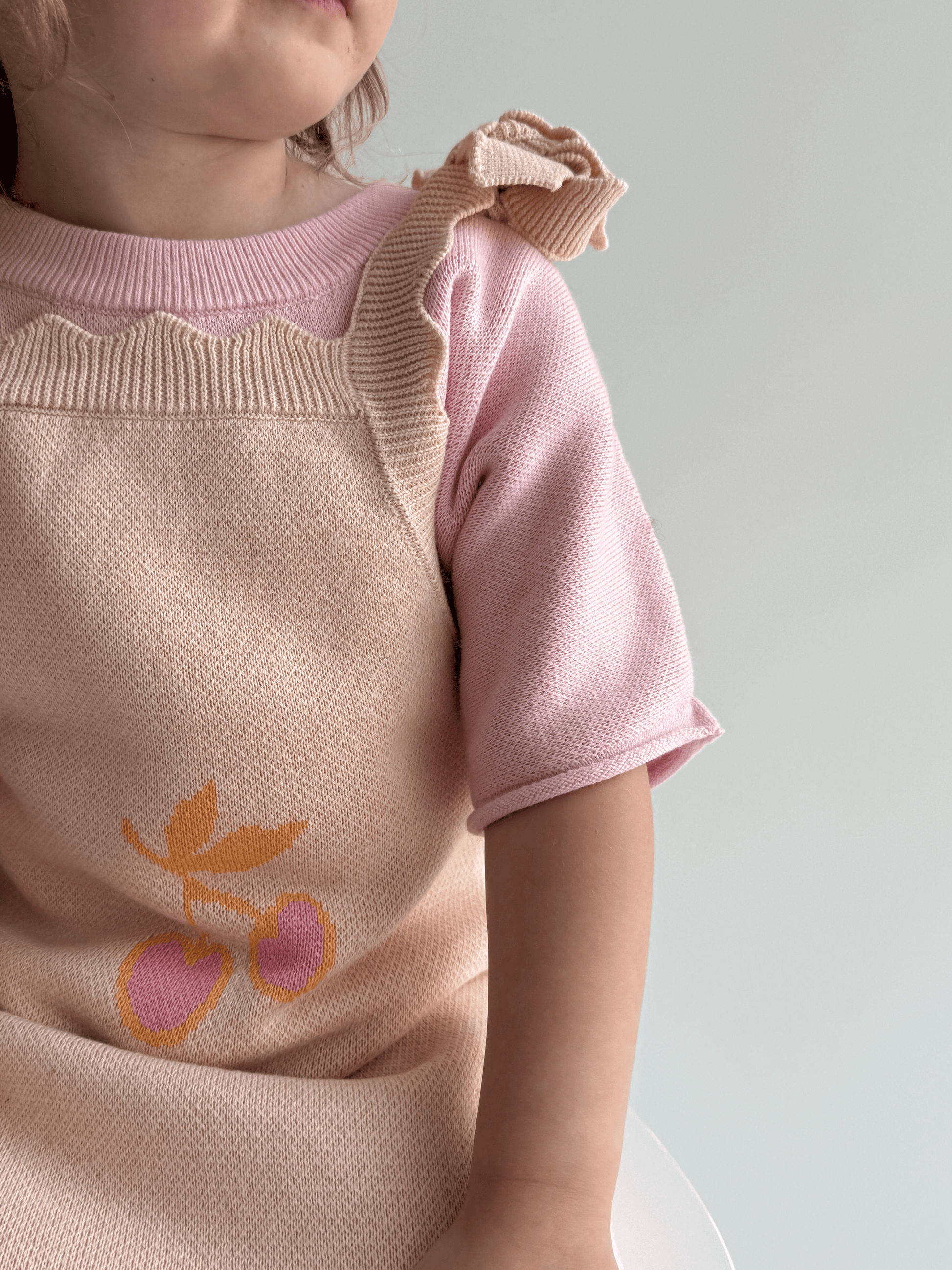A little sundress made for sweet summer days. The Airlie Knit Dress features a soft cream body with a pink and orange cherry detail on the front. Super adjustable tie up shoulders make this dress playful, simple and easy for everyday wear. Layer with our Airlie knit tee (pictured) and Airlie knit shorts underneath, or our logo tee in pink or white for the perfect look.