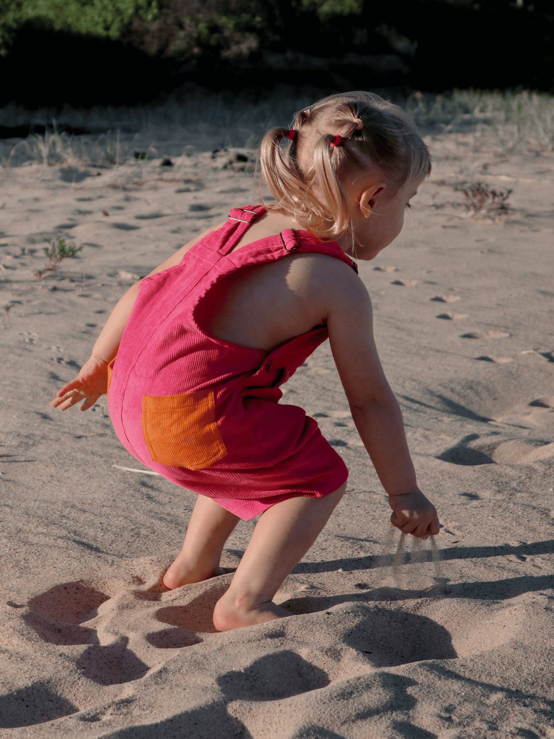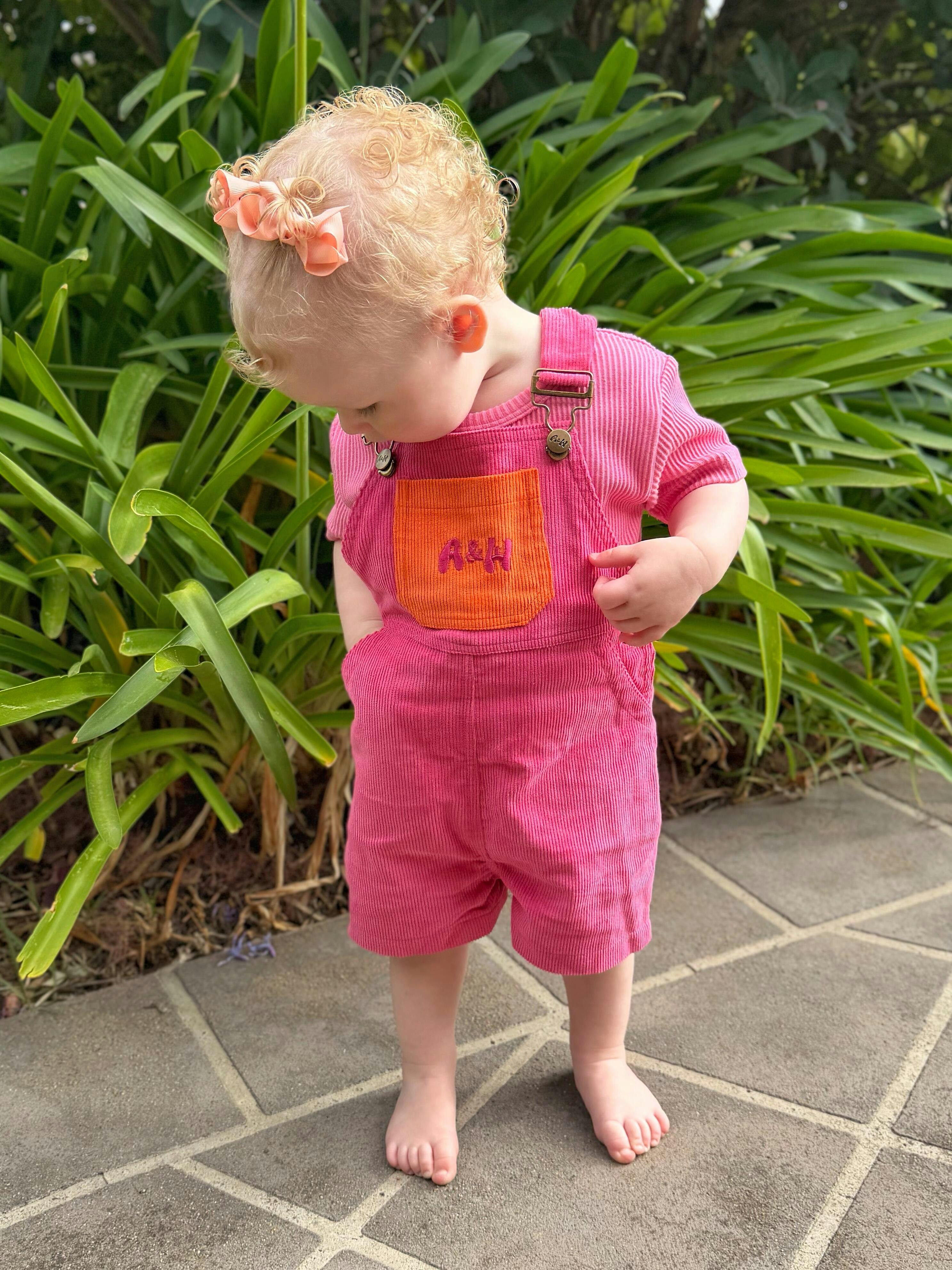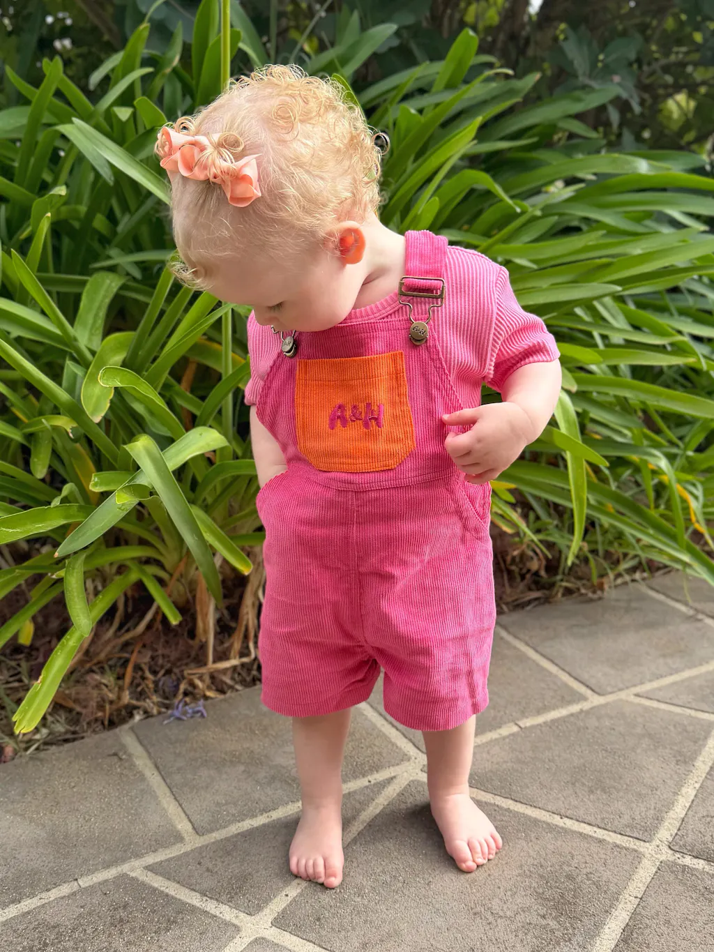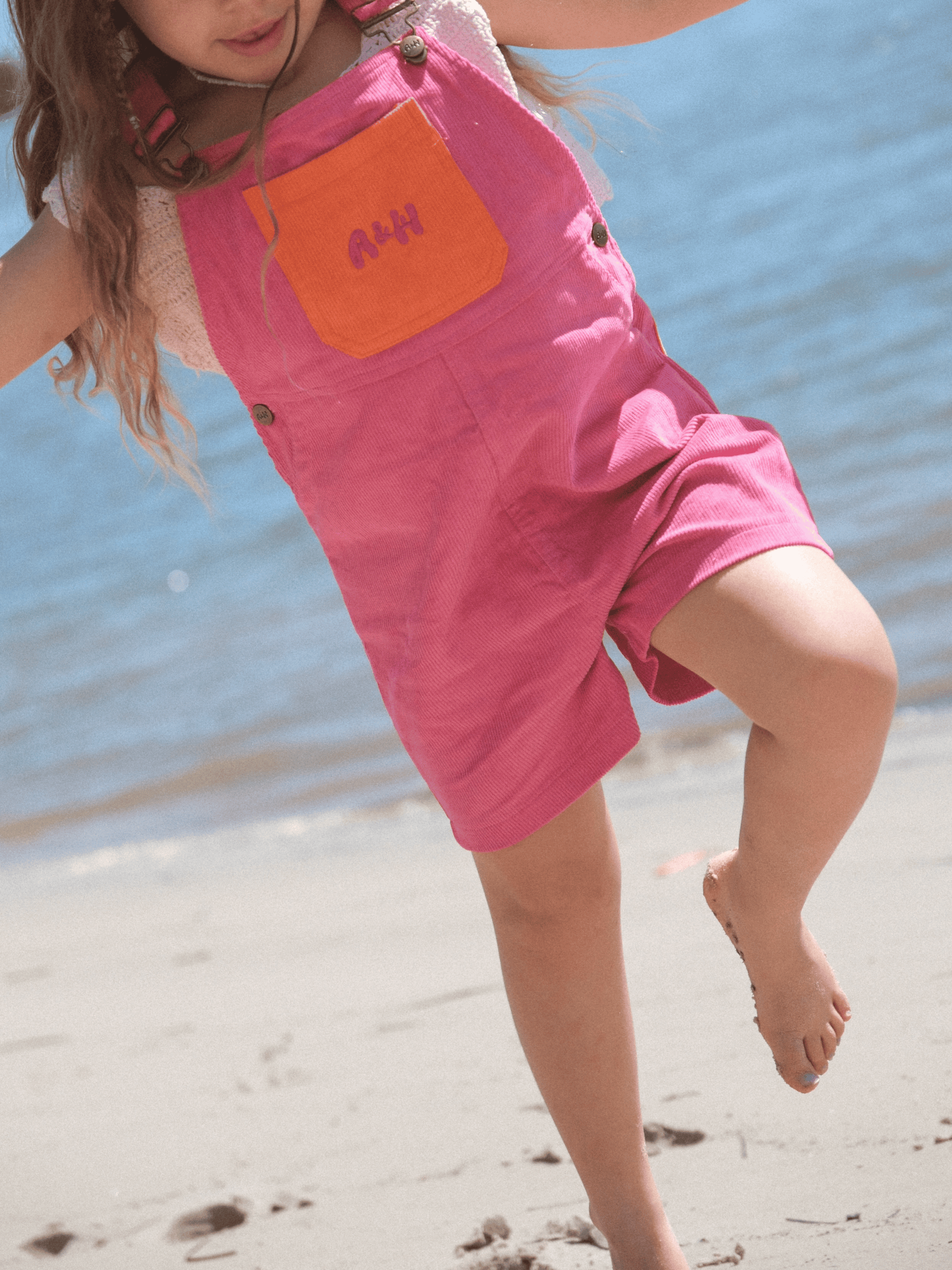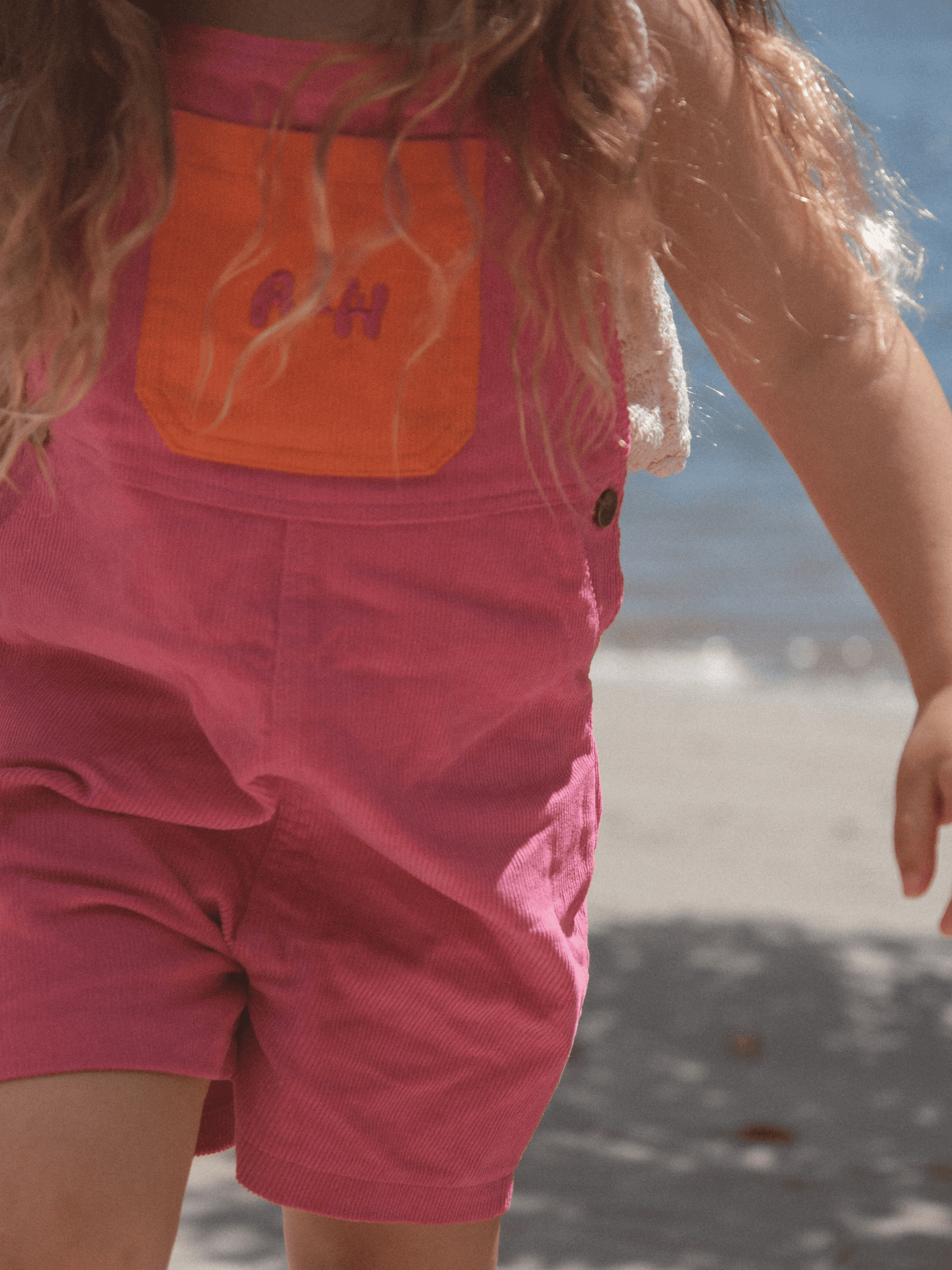 Our Cali Overalls bring a fun pop of colour to everyday outfits. Pink corduroy with contrasting orange chest and back pockets for that perfect playful touch.